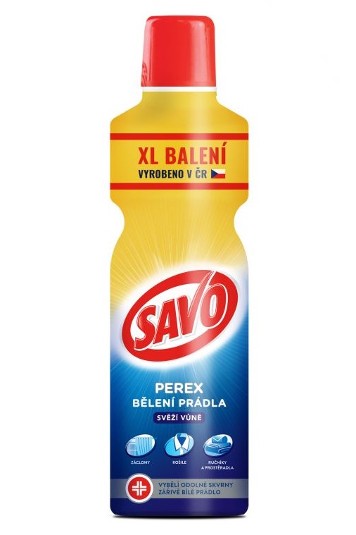 SAVO Perex Svěží vůně je parfémovaný přípravek pro předpírání a bělení bílého a stálobarevného prádla v automatických pračkách, ale i pro ruční bělení. Účinně odstraní skvrny již ve fázi předpírky. Je mimořádně účinný při bělení polyesterových a bavlněných záclon.