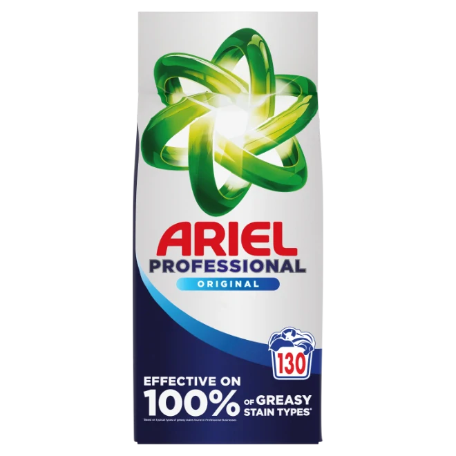 Prací prášek Ariel Professional je navržený speciálně pro profesionální použití. Výborně čistí a odstraňuje skvrny, které jsou typické pro profesionální provozy. Je vyvinutý tak, aby dosahoval vynikajících výsledků už při prvním praní bez nutnosti namáčení nebo předpírky. Uchovává barvy zářivě bílé již po prvním vyprání a zároveň dodá prádlu příjemnou svěží vůni.