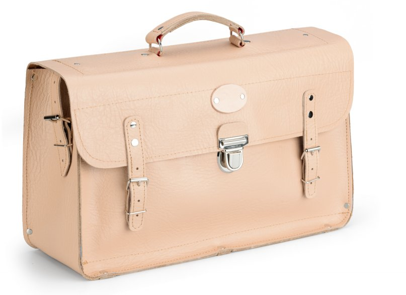 Instalatérská brašna z přírodní usně s vyztuženým dnem a kapsou na výkresy.