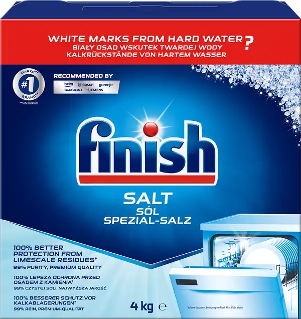 Účinně napomáhá změkčení vody v myčce a zvyšuje tak čisticí efekt mycích prostředků. Pro dosažení nejlepších výsledků pravidelně kontrolujte správné množství regenerační soli Finish ve Vaší myčce. To je silně doporučeno, pokud máte tvrdou vodu ve Vaší domácnosti.