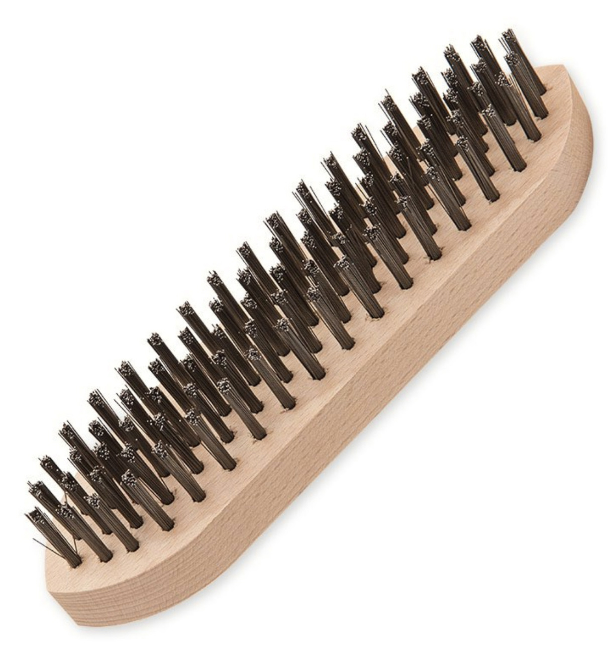 Univerzální ruční dřevěný kartáč, tzv. "lodička", osazený hladkým ocelovým drátem v pěti řadách.