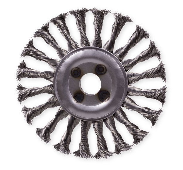 Radiální copánkový kartáč o průměru 150 mm, osazený hladkým ocelovým drátem o průměru 0,40 mm, s upínacím otvorem o průměru 22,2 mm. Maximální otáčky 9 500 rpm.