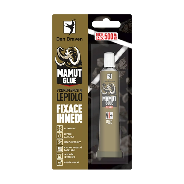 Jeho největší výhodou je okamžitá fixace 500 kg/m2. Využijete ho všude tam, kde potřebujete něco rychle přilepit a nemůžete předmět z jakýchkoliv důvodů zatížit, než lepidlo vytvrdne. S tím souvisí jeho tužší konzistence. Lepidlo MAMUT GLUE High Tack nahrazuje hřebíky, šrouby a nýty. Jedná se o speciální modifikaci MS polymerů, vytvářející po vytvrzení přetíratelný vysokopevnostní a elastický spoj. Není agresívní k podkladům, je ideální pro lepení zrcadel.