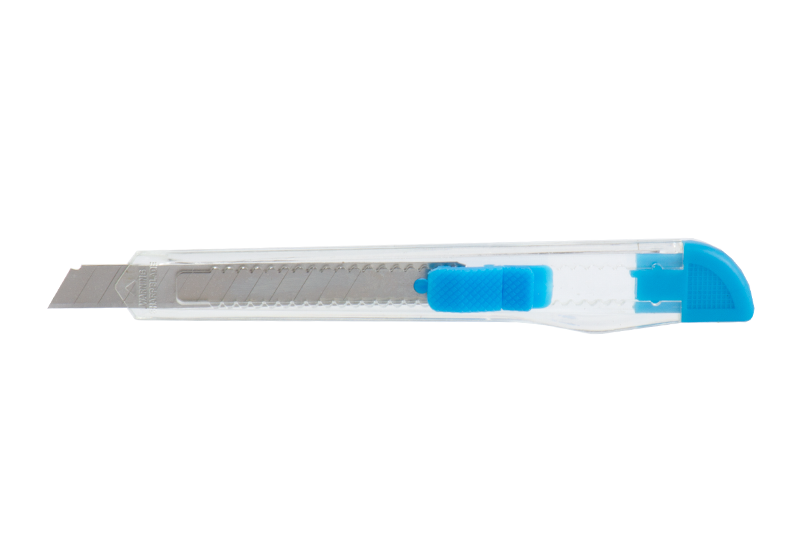 Plastový nůž s odlamovacími břity a aretačním tlačitkem.