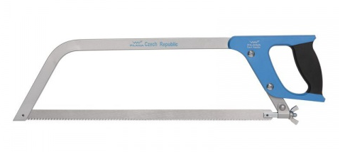 Řeznická pilka na řezání kostí v masném průmyslu. Rám z masivní ploché oceli. Chromované spojovací díly. Lakovaná dřevěná, ergonomicky tvarovaná rukojeť. Vyměnitelný ocelový list.