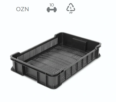 Klasická perforovaná nízká přepravka na ovoce a zeleninu, která zaručuje proudění vzduchu a tím i delší životnost potravin. Je vyrobená z PP a odolná. Vyniká svojí nízkou hmotností. Maximální zatížení je 10 kg.