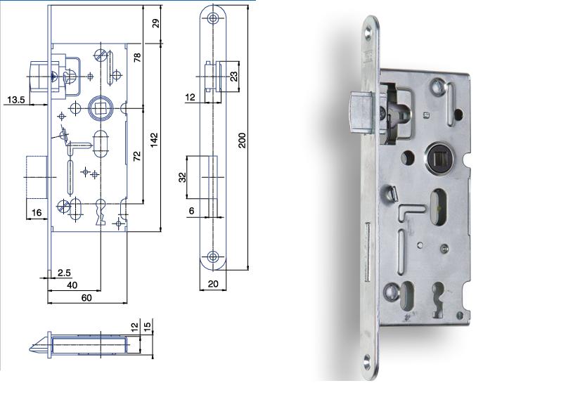 Jednozápadový zámek bez převodu pravo - levý. S otvory pro dělené štíty kování.