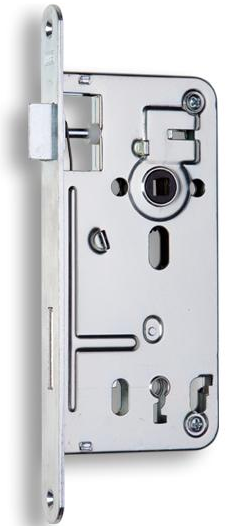 Zadlabací zámek na obyčejný klíč, bez převodu, pravo-levý, dvouzápadový. Má otvory pro dělené štíty.Osová vzdálenost klíče od čela zámku 50mm. Zámek je standardně dodáván s jedním klíčem. Povrchová úprava bílý zinek.