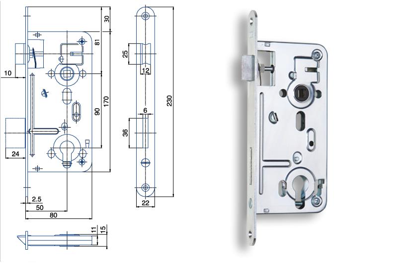 Zadlabací zámek vložkový dvouzápadový s převodem pravo - levý. Otvory pro dělené štíty.