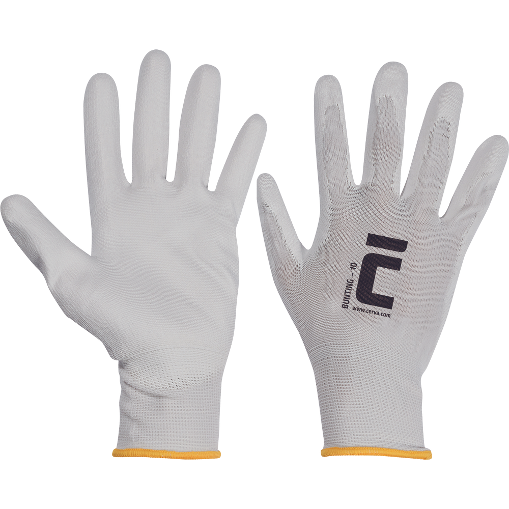 Pletené bezešvé nylonové rukavice, s tenkou vrstvou polyuretanu v dlani a na prstech a pružnou manžetou. Rukavice splňují normy EN ISO 21420 a EN 388 (4131X).