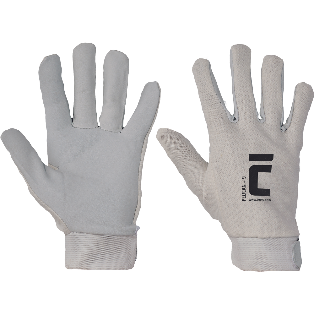 Rukavice šité z jemné lícové ovčiny v dlani, bílé bavlněné tkaniny na hřbetu a manžetou na suchý zip. Splňují normy EN 420 a EN 388 (2111X).