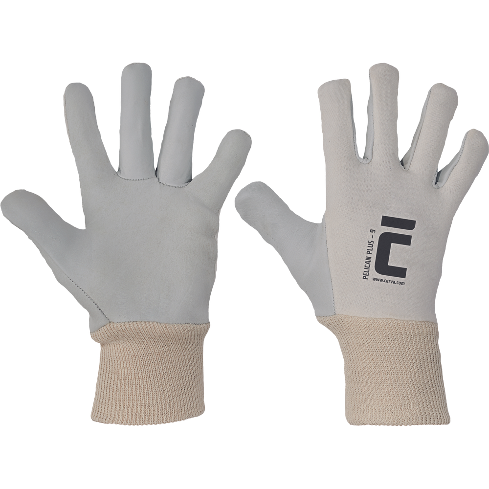 Rukavice šité z jemné lícové ovčiny v dlani, bílé bavlněné tkaniny na hřbetu a s nápletem.Splňují normy EN ISO 21420 a EN 388 (1111X).