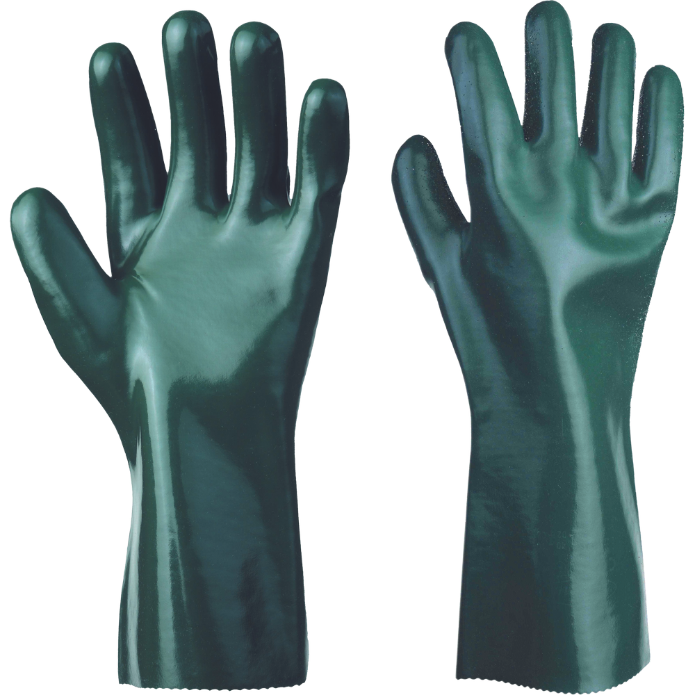 Šitý bavlnený úplet máčený v PVC s nitrilem, ochrana proti mechanickému a chemickému riziku, délka 35 cm. Splňují normy EN 420, EN 388 (3121X), EN ISO 374-1 (type A A2 J2 K6 L6 M4 N3 O2 P6 S6 T6)