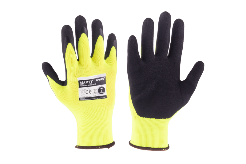 Bezešvé pletené rukavice ze syntetické příze s nánosem latexu na dlani a prstech. Pružná manžeta. Splňují normy EN ISO 21420 a EN 388 (2131X).