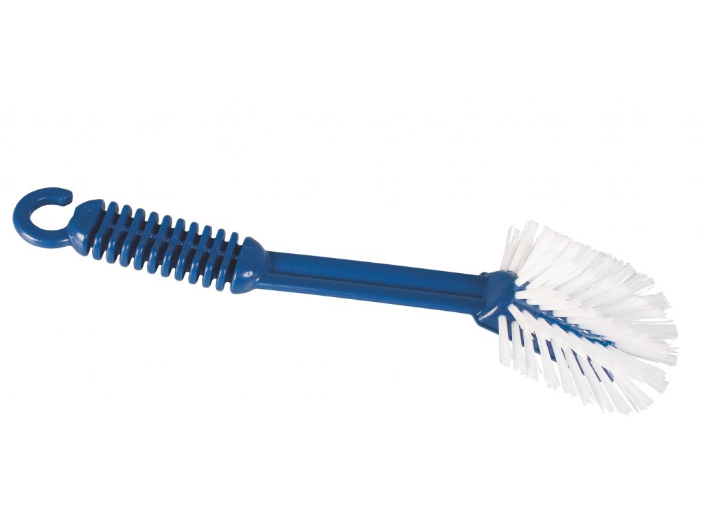 Plastový kartáč na nádobí se syntetickými vlákny.