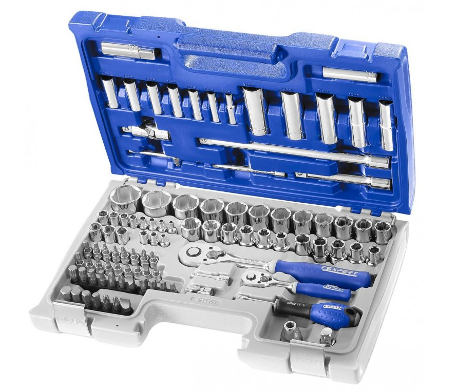 Tona Expert kombinovaná sada hlavic 1/4" a 1/2" 98 dílů dodávána v kufříku s kovovými přezkami a panty umožňující uložení v zásuvce pojízdné montážní skříňě.