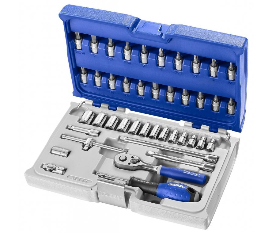 Tona Expert 1/4" sada hlavic 42 dlíná dodávána v kufříku s kovovými přezkami a panty, umožňující uložení v zásuvce pojízdné montážní skříně.