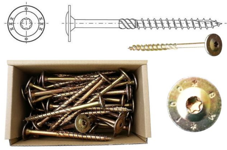 Stavební nebo-li konstrukční vruty do dřeva s vnitřním hexalobulárem, s talířovou hlavou. Vruty jsou mimo klasického žlutého zinkochromátu upraveny také kluzným lakem pro pohodlnější zašroubování bez předvrtání. Uprostřed dříku je také fréza pro výrazné usnadnění zavrtávání dlouhých vrutů. Speciální frézované špičky umožňují snadnější vnikání i do velmi tvrdého dřeva.