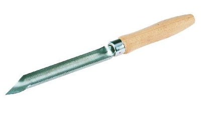 Vypichovač plevele s plastovou/dřevěnou rukojetí.